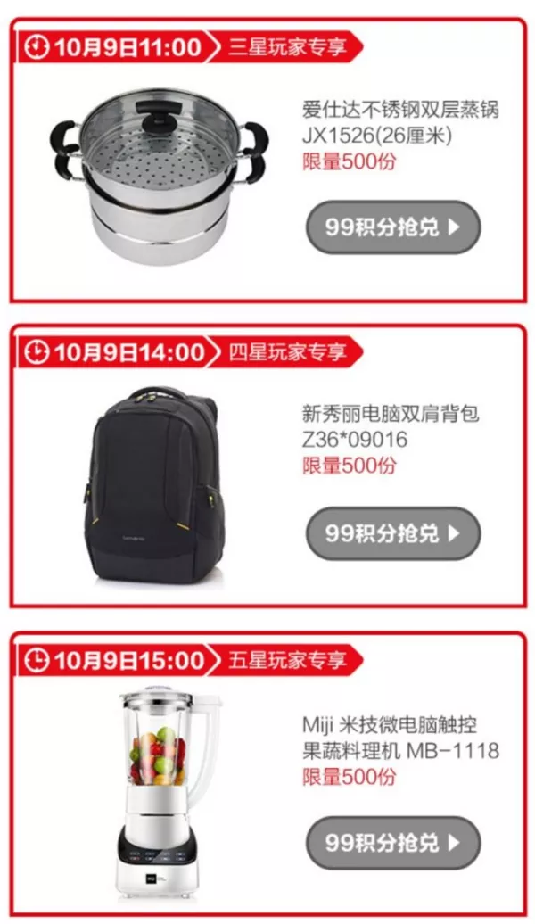 一重好礼:99积分抢果蔬料理机、双层蒸锅、双肩背包