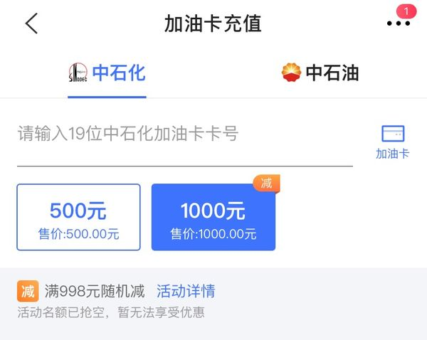 用户在买单吧加油卡充值现金支付满998元,并通过买单吧支付,可享随机立减优惠,最高立减100元。活动期间每位用户仅限使用1次,名额有限,先到先得。