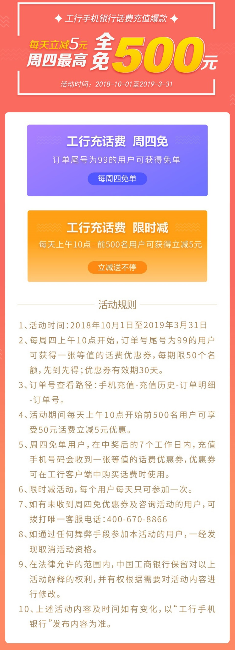 工商银行APP-惠生活-话费优惠,充值话费享50-5元优惠(每天500个名额)