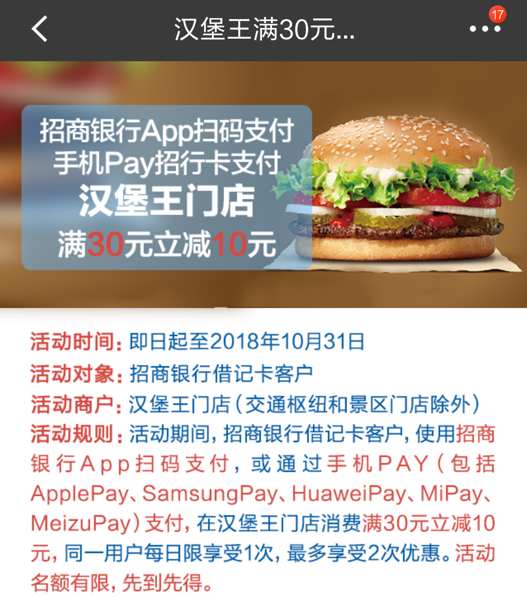 1、活动期间,持卡人至汉堡王门店使用“招商银行”APP扫码支付或手机Pay支付满30元减10元,最高优惠10元;