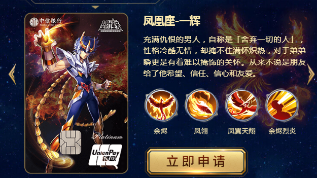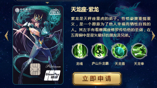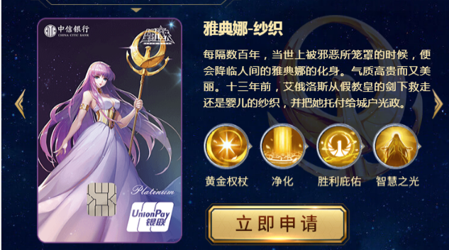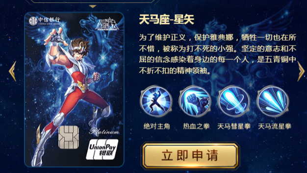 继招商银行出来圣斗士联名卡之后,中信银行也新上市了中信银行圣斗士星矢联名卡。会让你在中信和招商做出一部分选择。主要是从卡图设计、卡权益、新户礼上看看哪个卡更适合自己。