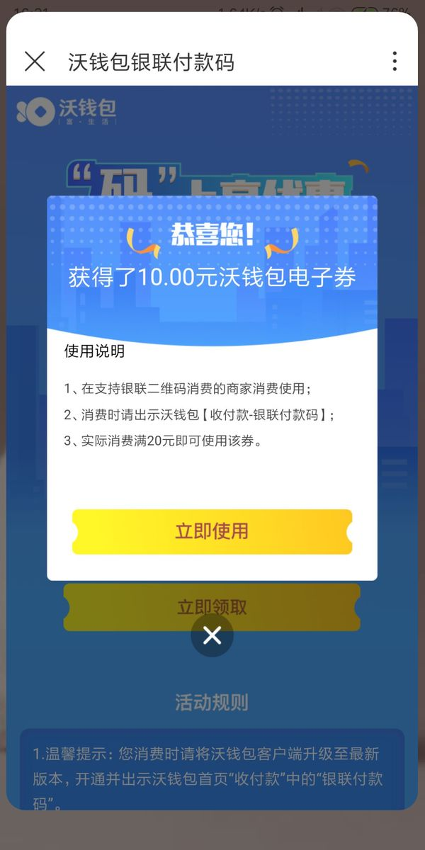 领取一张10元电子券,在支持银联二维码支付的商家消费,订单金额满20元可抵扣。每天限量抢领,每人限使用1次,先到先得哦。