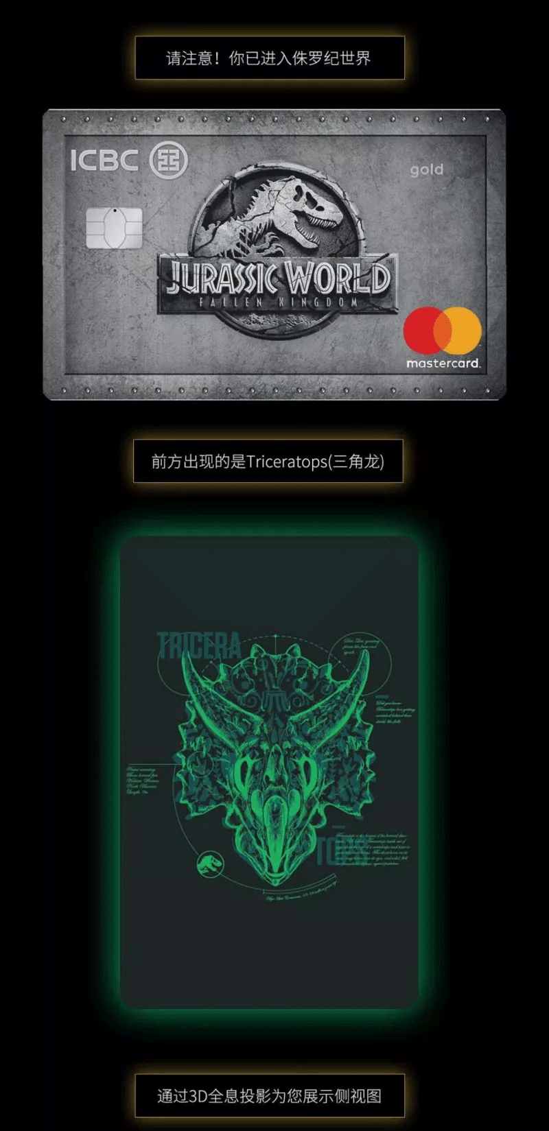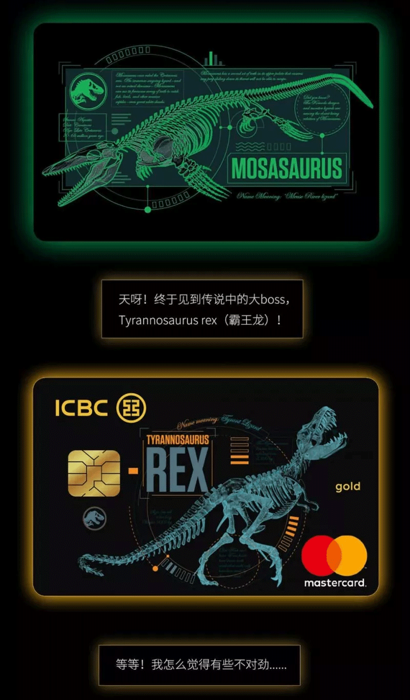 各位恐龙迷有福利了。工商银行携手环球影业同步推出“宇宙侏罗纪世界信用卡”,官网有两款精美卡面,具有珍藏价值且限量发行。但是宣传页面可是非常震撼!