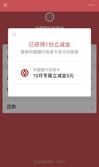 使用微信进入—我的—钱包—点击中国银行信用卡,会显示10月使用信用卡专属立减2-5元,大概率为5元,截止日期为10月25日。