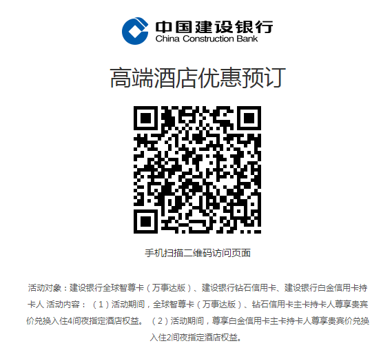 建设银行龙卡全球智尊卡(万事达版)/钻石信用卡/尊享白金信用卡主卡用户,可享近200家境内外酒店优惠预订礼遇: