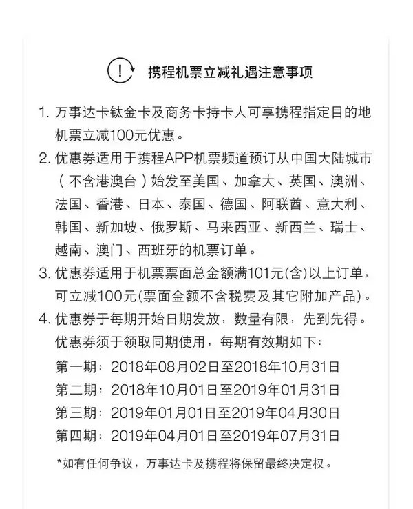 万事达卡钛金卡/商务卡用户,关注“万事达卡”微信小程序,完成验证即可在“我的收藏”中领取优惠券码,登录携程旅行APP选择指定国际机票(详见直达链接活动事项),输入优惠券码支付可享立减100元优惠,数量有限,先到先得。