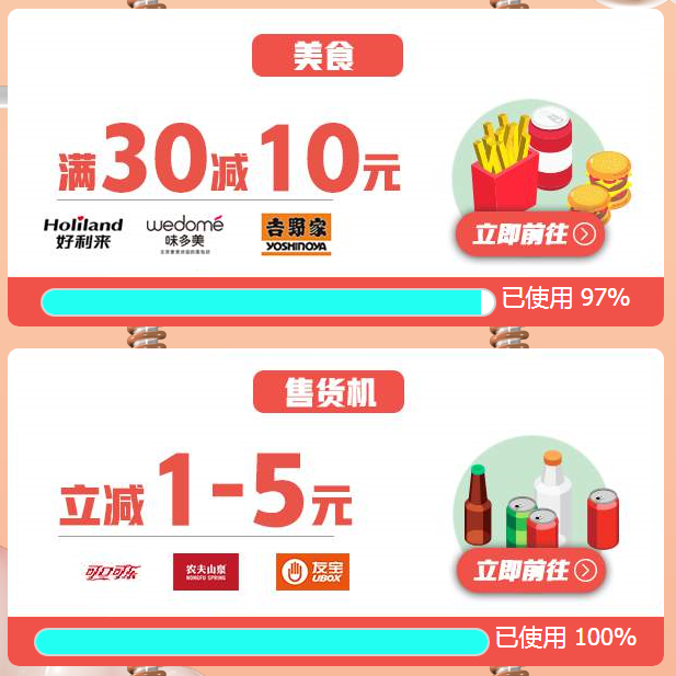 美食: 好利来,味多美,呷哺呷哺,汉堡王等满30减10元