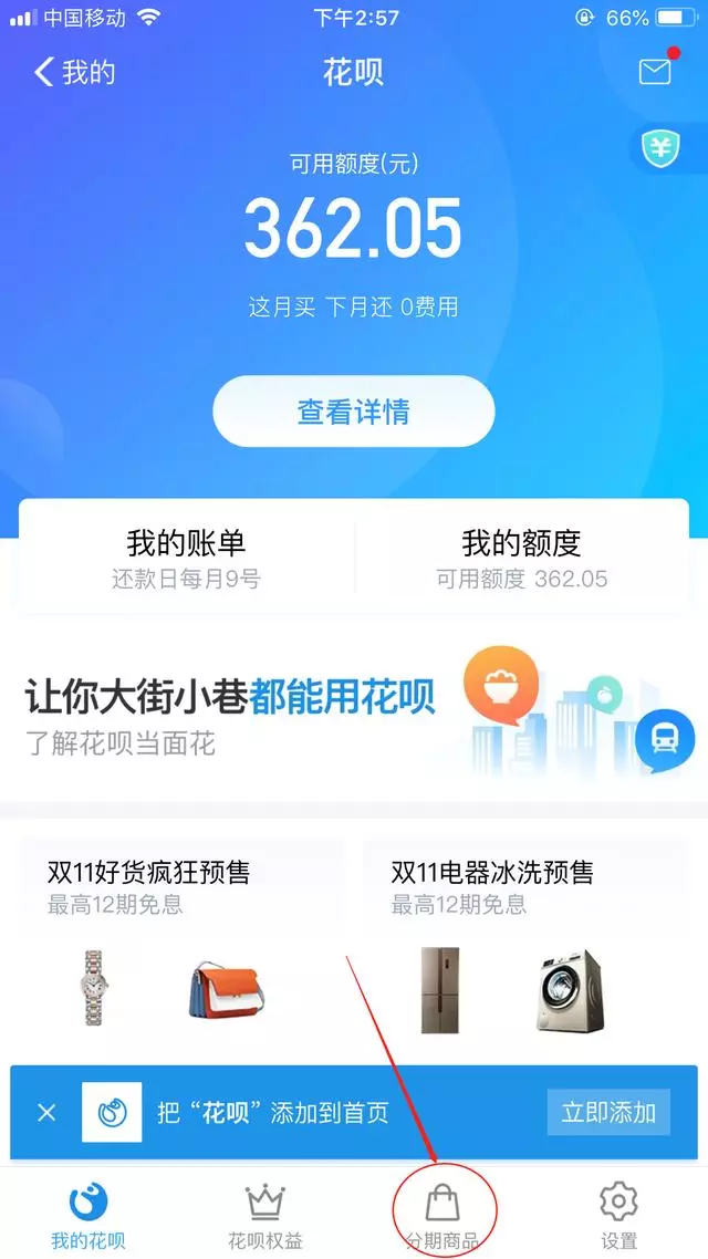 打开支付宝,进入花呗,右下角就可以看到分期商品。