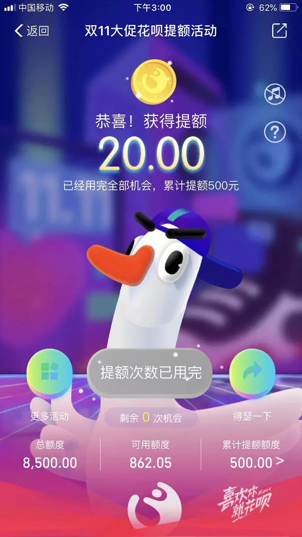 临近双十一各平台活动也是早早的就推出,支付宝中的花呗也有提额活动,不知道在哪的朋友可以参考下图,小编来为你们讲解如何提额。