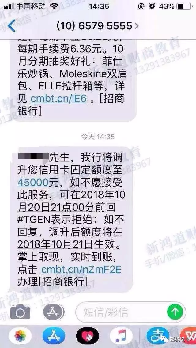 3、招行超过半年没提额的就自己去掌上生活看看,或许就有惊喜,如果你收到短信,那么更是稳如香蕉巴拉!