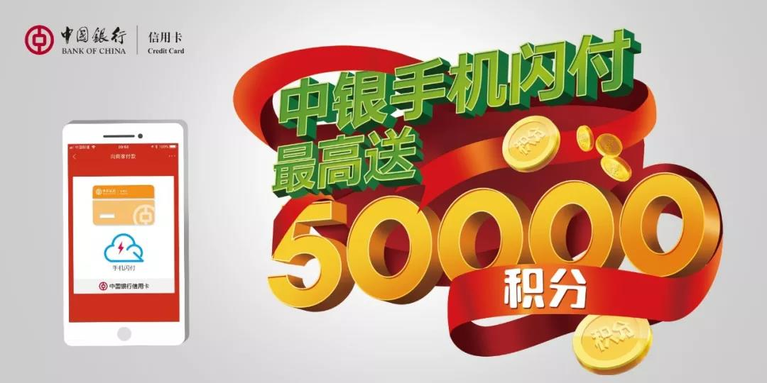 活动期间,客户使用中国银行信用卡,通过手机闪付(Apple Pay等)进行交易,单笔金额满10元即可获赠1000信用卡交易积分。活动期间每卡限赠50笔,共赠送150万笔,所有满足条件的交易将按照交易时间进行排序,先到先得。