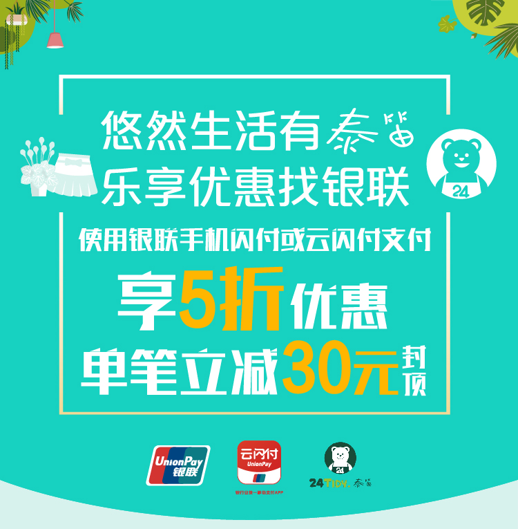 在泰笛生活APP通过 Apple Pay / 安卓Pay / 银联云闪付三种方式进行付款即可享每单5折优惠(单笔封顶30元),单用户每日1次,先到先得。