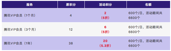 腾讯视频会员(1月/3月/1年)原价:4/12/38积分现价:2/6/20积分(5折/5折/5.3折)