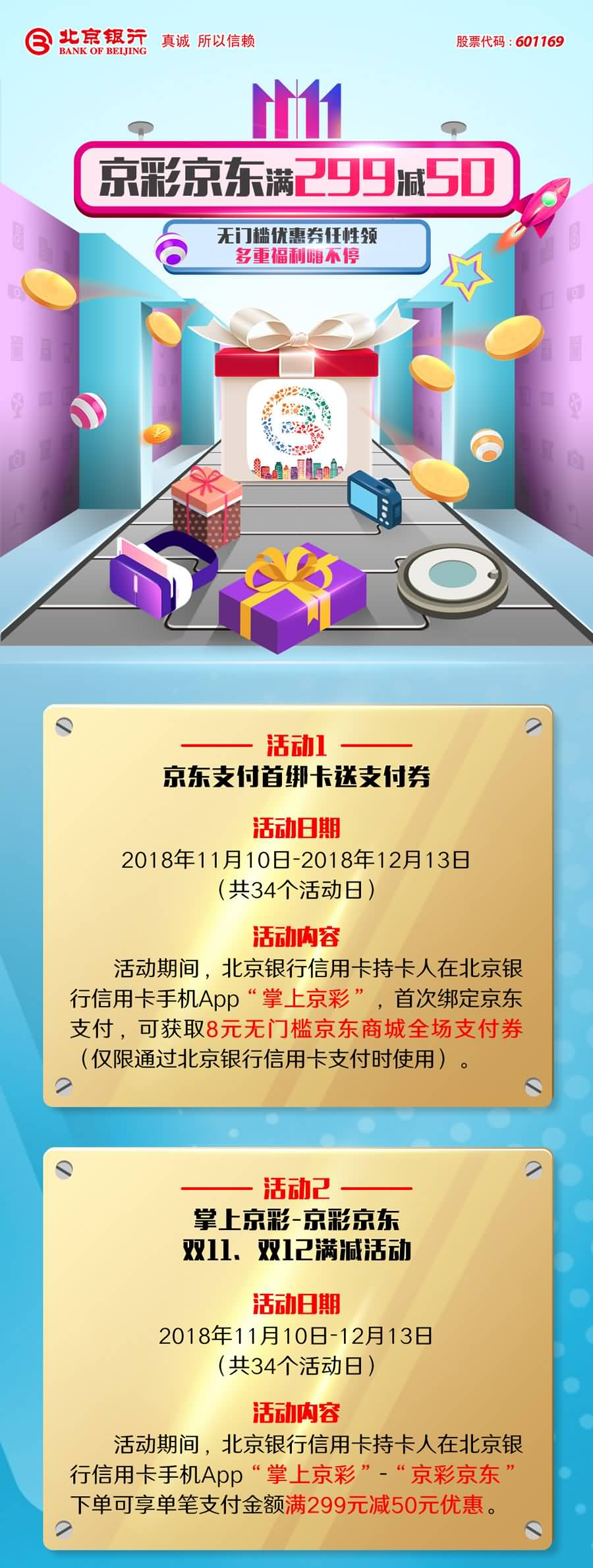 活动期间,北京银行信用卡持卡人在北京银行信用卡手机App“掌上京彩”-“京彩京东”下单可享单笔支付金额满299元减50元优惠。另外,新绑卡用户还可以获得立减8元的机会。
