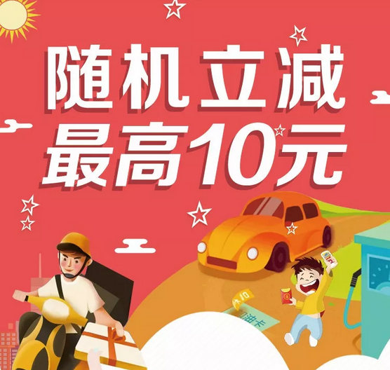 手机充值、加油卡充值、外卖、游戏充值、视频会员、机票、火车票、酒店产品可享受随机立减优惠