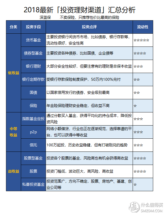深蓝君按照投资收益的高低,把常见的投资渠道按由低到高排列,方便大家直观对比: