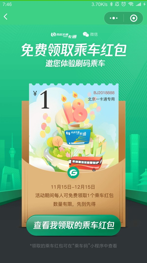 北京地区用户微信扫描二维码,转到微信小程序“乘车红包”,即可领取1元乘车红包,乘坐公交车自动抵扣,同时享5折优惠,每人限领1次,数量有限,先到先得。