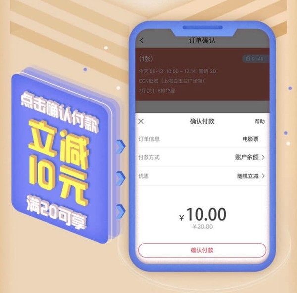 翼支付绑卡用户每周在翼支付APP-电影票消费,支付满20减10元,限每周前6000名电信用户,每用户每周只限一次。