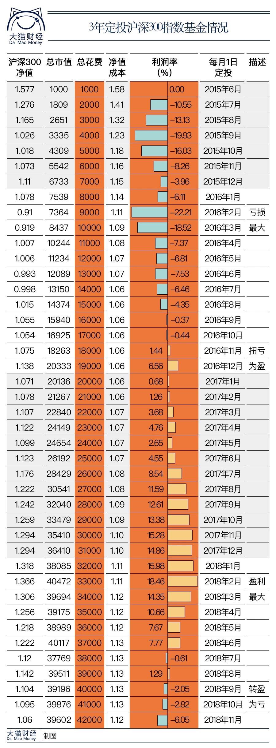 3年前,猫哥定投了沪深300指数基金,这只产品是华夏沪深300ETF联接A(代码000051),每个月执行1000元的定投计划,固定在1日扣费。2015年6月,买入的净值是1.577元,一直持续到2018年11月。
