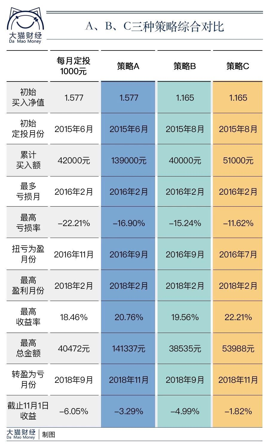 猫哥再给大家做个整体汇总,原始定投与A、B、C三种策略进行综合比对: