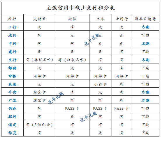 一、主流信用卡线上支付积分表