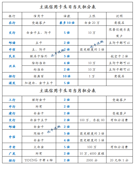 二、主流信用卡生日积分表