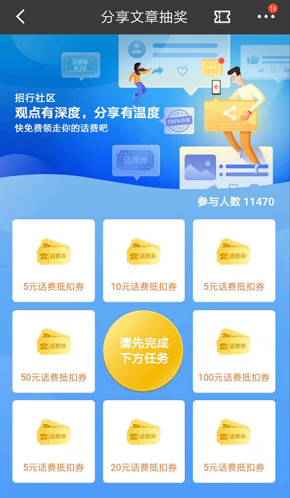 招商银行APP送福利了,抽奖最高送100元话费充值券,而且还是百分之百中奖话费券哦,最低也有5元呢,可以说是个不错的小羊毛。
