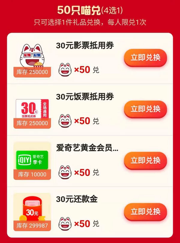 完成任务:饭票/还款/游戏/无卡支付等方式获取6只小招喵(最多90只)