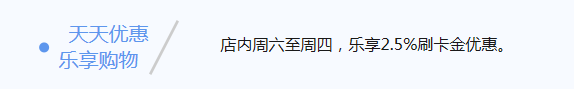 每周六——周四,店内沃尔玛卡消费享受2.5%的刷卡金优惠,即可理解为返现了。