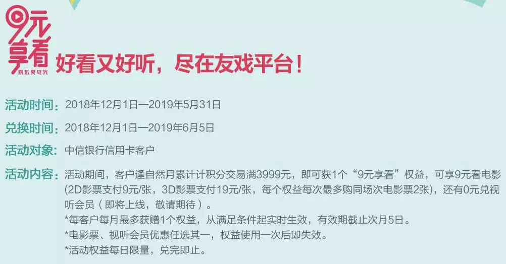 话说中信三大经典基础活动“9积分”、“9享看”、“精彩365”,前阵子后面两个活动结束后就没有续期,连招牌活动“9积分”也是苟延残喘,一个月一个月地延续,生怕哪天就没了。