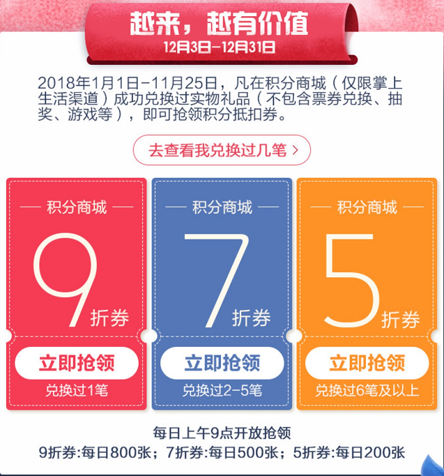 ●12月3日-12月31日,9点抢积分折扣券,满足2018年11月25日前兑换条件可领,1笔9折,2-5笔7折,6笔及以上5折嗨兑