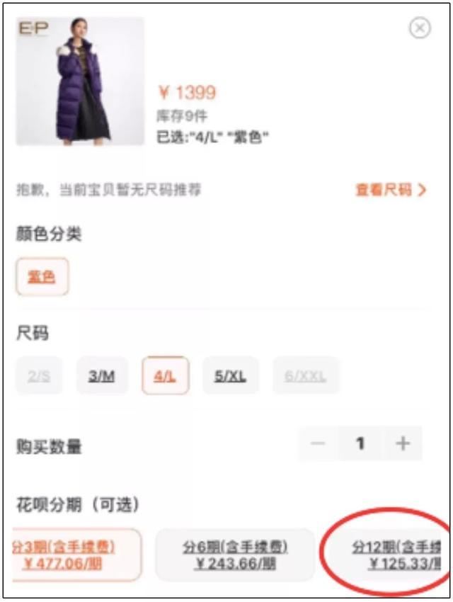 比如,猫姐今天看到一件衣服,售价为1399元,如果分12期(即12个月)购买,每期需支付125.33元。