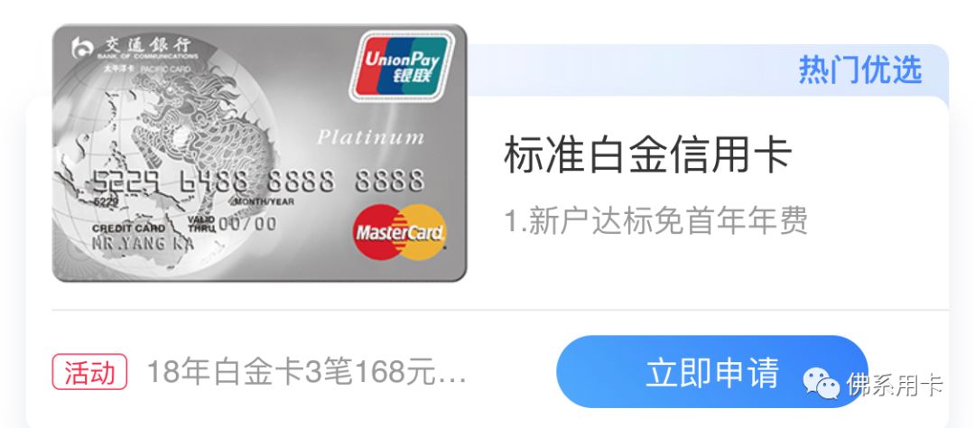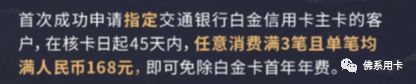 首次成功申请指定交行白金卡客户,在核卡起45天内,任意消费满3笔且每笔满168元就可以免除白金卡首年年费。