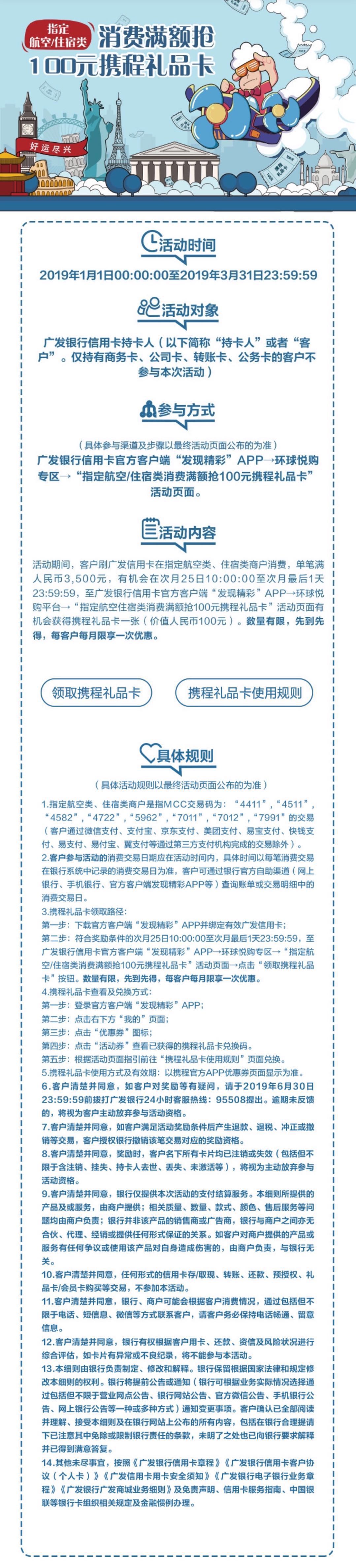 持卡人每月在指定航空、住宿(MCC为4411、4511、4582、4722、5962、7011、7012、7991)单笔消费满3500元,即可于次月25日10点起至发现精彩APP-环球悦购-抢100元携程卡一张。