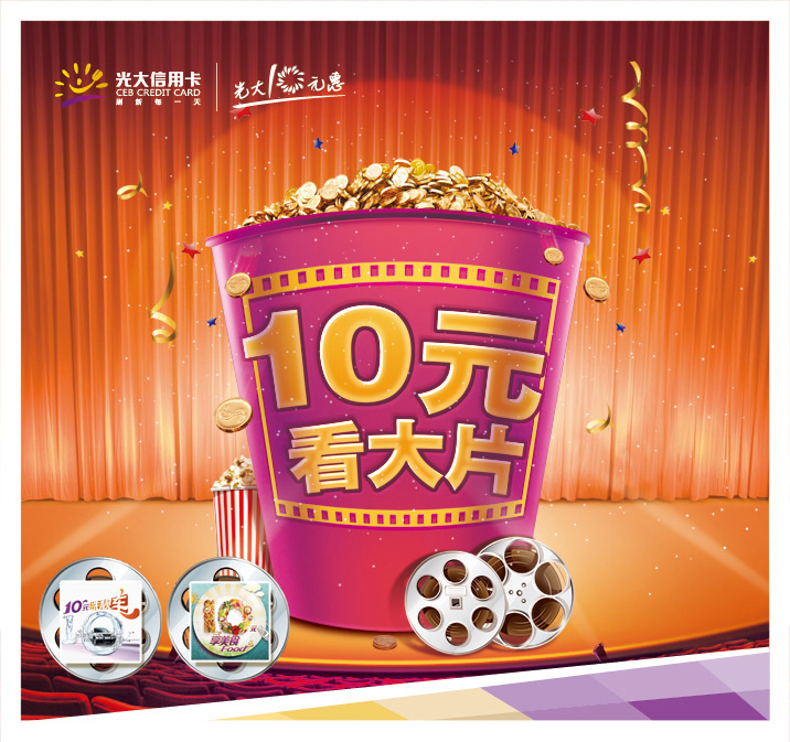 使用中国光大银行信用卡在指定影院仅刷10元或至“阳光惠生活”购买电子券即可购得电影票一张(各地活动影院、观影日期及活动细则详见影院列表)
