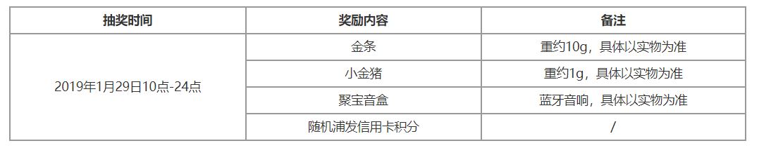2019年1月23日10点-2019年1月25日24点,浦发银行信用卡持卡人(下称“持卡人”)通过“浦发信用卡”APP-“新春黄金红包”活动专区或“浦发银行信用卡”官方微信公众号-“小浦福利”-“消费红包 全能积分”-“新春黄金红包”活动专区,点击“我要拜年”后,转发“拜年”链接到微信好友、微信群或微信朋友圈给好友拜年,每得到5位不同好友的拜年,该持卡人可获得一个黄金红包,打开黄金红包可随机获得“福”、“禄”、“寿”、“喜”、“财”任意一个字,持卡集齐“福”、“禄”、“寿”、“喜”、“财”五个字后可在2019年1月29日10点-24点抽取一份新春奖励,奖项含金条(共计100份)、小金猪(共计500份)、聚宝音盒(共计2万份)及随机浦发信用卡积分(数值随机,共计59400份),奖品详情请见如下表格。活动1新春奖励限量8万份,每位持卡人最多获得一份新春奖励,先到先得。