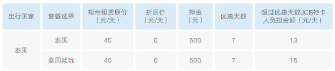 JCB信用卡持卡人扫描专用优惠二维码,平日提前7天假期提前10天预约租赁泰国指定境外随身WiFi,最高7天免境外随身WiFi租赁费用。每卡限租1台,共1000台,领完为止。超过优惠天数,可享以下租赁优惠费用: