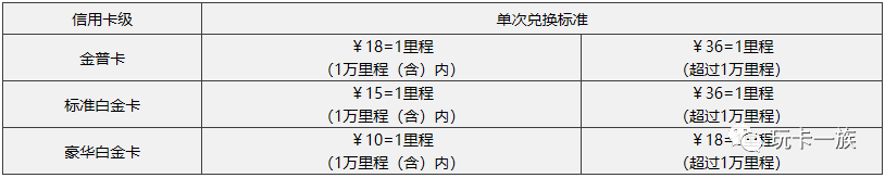 里程累积比例:标准白金卡为8信用卡积分=1里程;精英白金卡为12信用卡积分=1里程;金卡为15信用卡积分=1里程;普卡为18信用卡积分=1里程