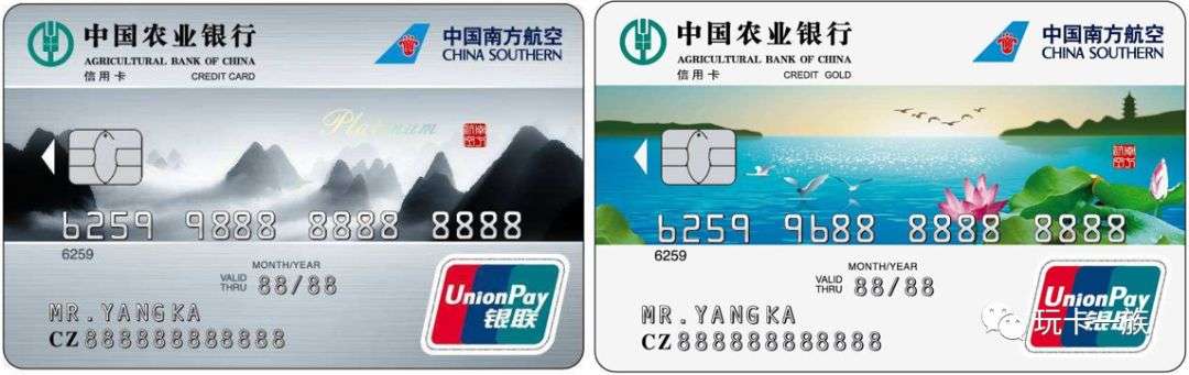 中国农业银行南航联名卡共分为两种:水版和山版,金卡和白金卡两个等级。每一种又包含银联单标和Visa单标两款产品。