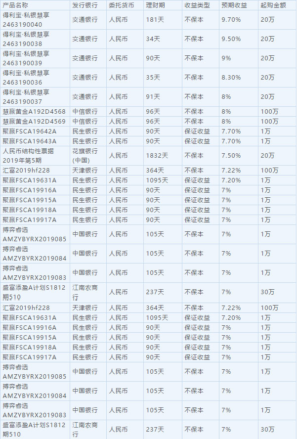 3月7日在售高收益银行理财产品:今日在售预期年化收益率在9%以上的银行人民币理财产品共3款。交通银行发行的“得利宝·私银慧享2463190040”预期年化收益率最高,为9.70%。