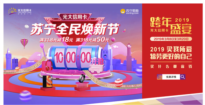 活动一:2019年3月8日-2019年3月17日和2019年3月19日-2019年3月20日期间,每活动日上午10:00:00开始,中国光大银行信用卡客户在苏宁易购APP或PC端官网消费,通过“苏宁支付”选择光大银行信用卡支付即有机会享单笔满31.8元及以上立减18元优惠。每活动日限前2,000名客户。活动一活动期间每客户限享一次,活动名额先到先得。