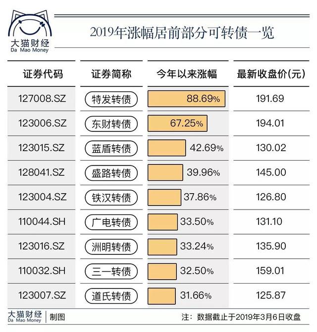 目前,已在A股交易的118只可转债,2019年以来全线上涨,无一下跌。从年内表现来看,涨幅超30%的有9只,另外还有15只涨幅在20%以上。截止3月6日收盘,特发转债涨幅88.69%高居榜首。另外,东财转债涨67.25%、道氏转债涨31.66%、盛路转债涨39.96%、蓝盾转债涨42.69%、铁汉转债涨37.86%、广电转债涨33.50%、三一转债涨32.50%、洲明转债涨33.24%。