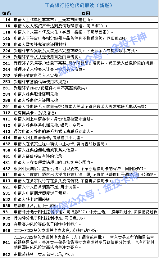 工商银行的内部拒绝代码及原因,为大家整理成以下表格(老版),直接点击图片查看: