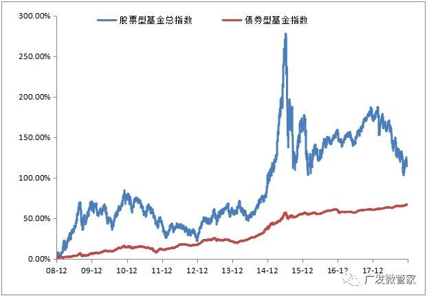对比股票型基金和债券型基金指数过去十年走势图,可以看到股票型基金跌宕起伏,波动性大;而债券型基金指数平稳缓慢增长,波动性小。
