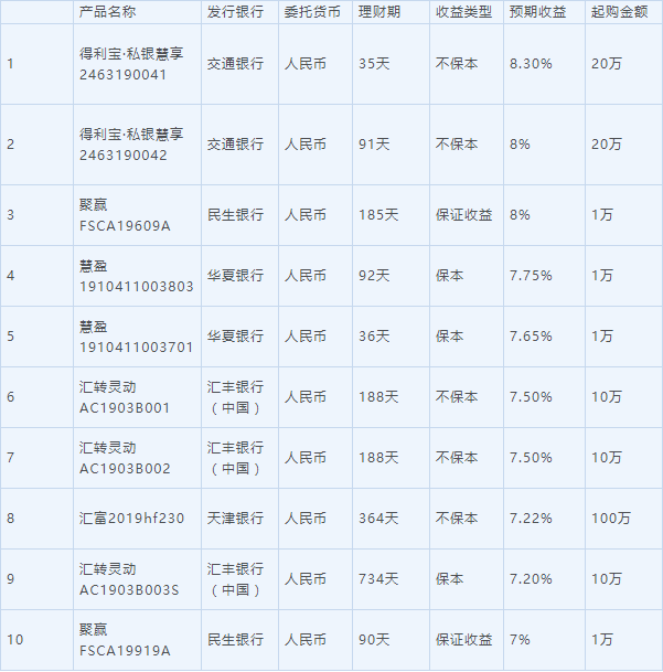 3月14日在售高收益银行理财产品:今日在售预期年化收益率在8%以上的银行人民币理财产品共3款。交通银行发行的“得利宝·私银慧享2463190041”预期年化收益率最高,为8.30%。