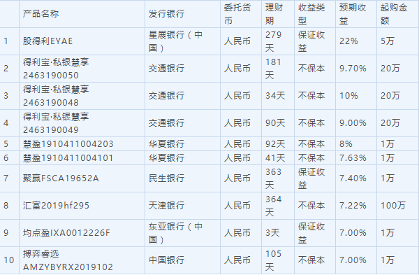 今日在售预期年化收益率在10%以上的银行人民币理财产品共2款。星展银行(中国)发行的“股得利EYAE”预期年化收益率最高,为22%。