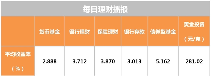 昨日整体产品收益均为下滑态势。银行理财产品平均收益率为3.712%,较前日下滑0.5BP。货币基金指数(平均七日年化)为2.888%,较前日下调0.8BP。保险理财较前日下降0.6BP;债基下滑1BP;金价下调70BP,为当日最大涨幅。(数据来源:中国电子银行网-财源源)