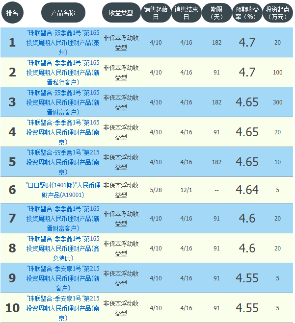 今日南京银行在售银行理财产品收益最高为“珠联璧合-双季鑫1号第165投资周期人民币理财产品(泰州)”,该款产品理财期限为182天,最高预期收益为4.7%,投资起点为20万元,该款产品4月10日-4月16日面向泰州发售。