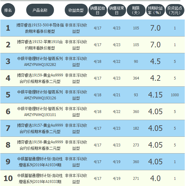 今日中国银行在售银行理财产品收益最高为“搏弈睿选19153-500半导体指数期末看涨价差型”,该款产品理财期限为105天,最高预期收益为7.0%,投资起点为1万元,该款产品4月17日-4月23日面向全国发售。