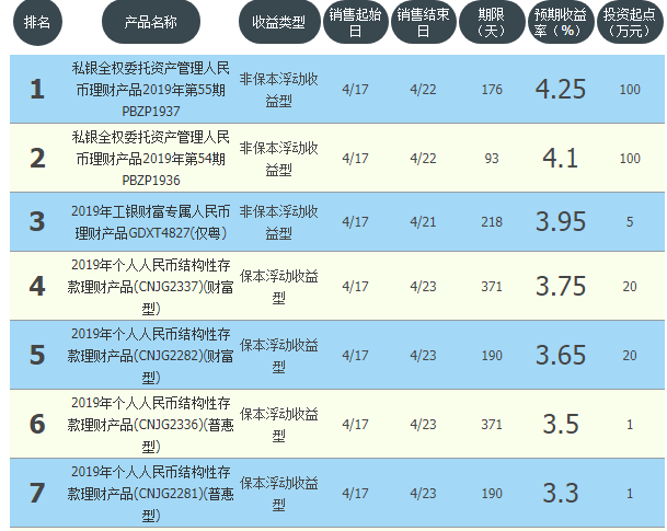 今日工商银行在售银行理财产品收益最高为“私银全权委托资产管理人民币理财产品2019年第55期PBZP1937”,该款产品理财期限为176天,最高预期收益为4.25%,投资起点为100万元,该款产品4月17日-4月22日面向全国发售。